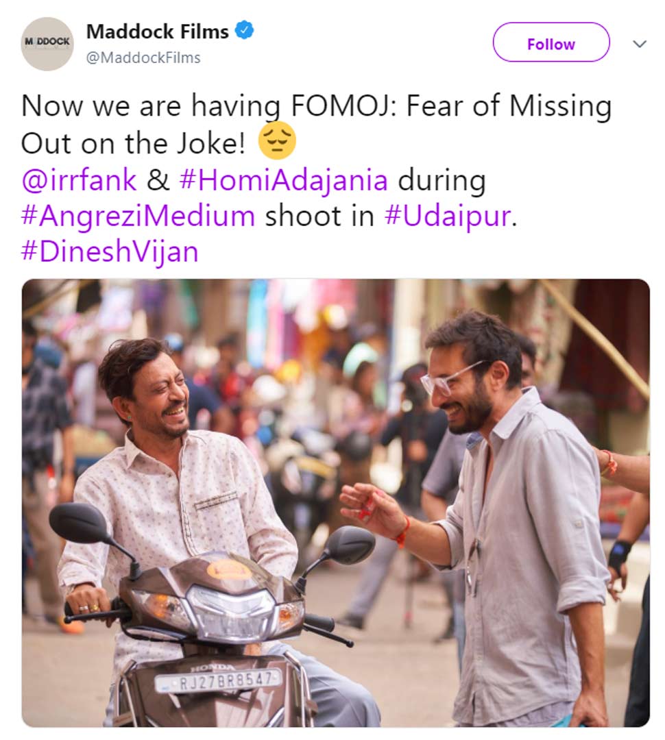 इरफान अब जल्द ही टीम के साथ लंदन रवाना होने वाले हैं, फोटो साभार: Twitter@Maddock Films